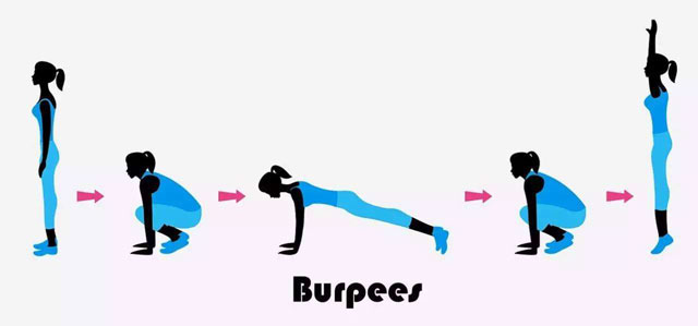 后背保持平直下蹲身体直至双手扶地,腰腹部用力双腿向后跳跃至俯卧撑准备姿势。做一个俯卧撑之后双腿再跳回到下蹲姿势,紧接着腰腹部继续用力,向上跳起,直至双脚离地,双手在头顶合十。