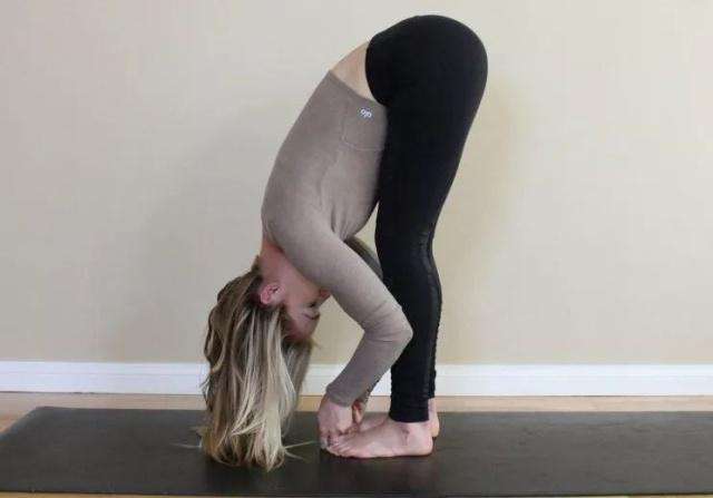 3、慢慢的弯曲上半身,直到臀部和大腿后侧有拉伸感,然后边吐气边站起来。